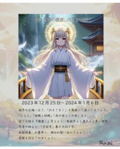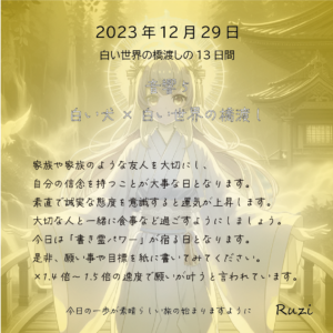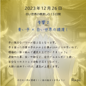 『白い世界の橋渡し』相手の立場に立ち、「おもてなし」を意識して過ごしましょう。「人と人」「組織と組織」「あの世とこの世」など、全ての物を『橋渡し』するように意識すると運気が上昇します。思考や物など、「手放す」事も大切です […]