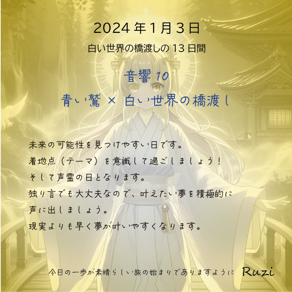 2024年1月3日 2024年1月3日 最終更新日時 : 2024年1月22日 ruzi-oracle 【音響10×青い鷲】未来の可能性を見つけやすい日です。着地点(テーマ)を意識して過ごしましょう!そして声霊の日となります。独り言でも大丈夫なので、叶えたい夢を積極的に声に出しましょう。現実よりも早く夢が叶いやすくなります。 FacebookX